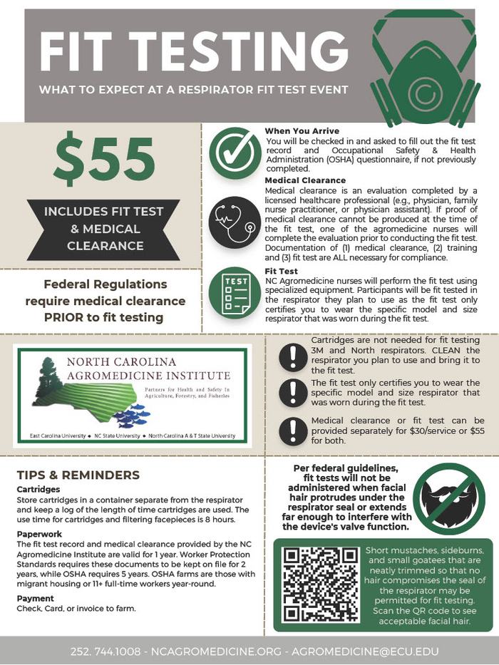 - The fit test record and medical clearance provided by the NC Agromedicine Institute are valid for 1 year.