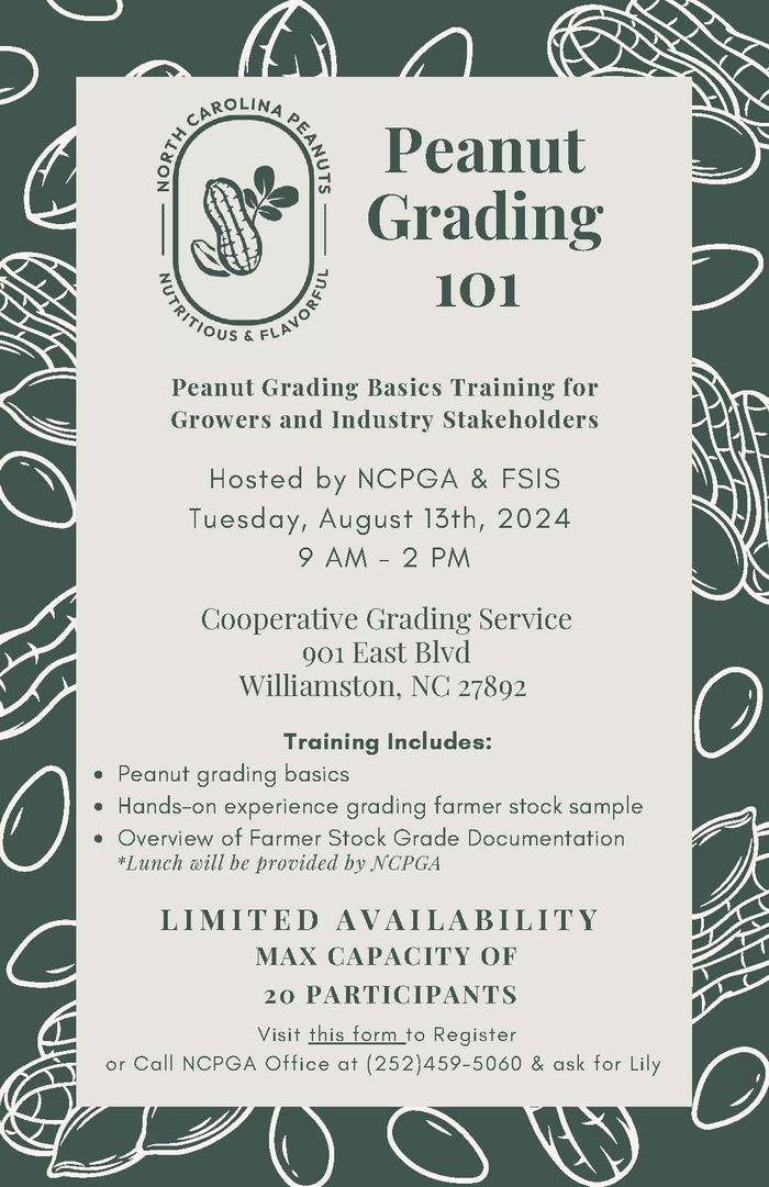 Date: Tuesday, August 12, 2024 Time: 9 am - 2 pm Location: Cooperative Grading Service, 901 East Blvd, Williamston, NC During the class, there will be a general overview of the grading system, an exercise involving hand tabulating a 1007 based on the information on the SC-95, and grading a sample of peanuts. Availability is limited to a maximum of 20 people, so be sure to register by clicking the "sign-up" button or by calling 252-459-5060 and ask for Lily.